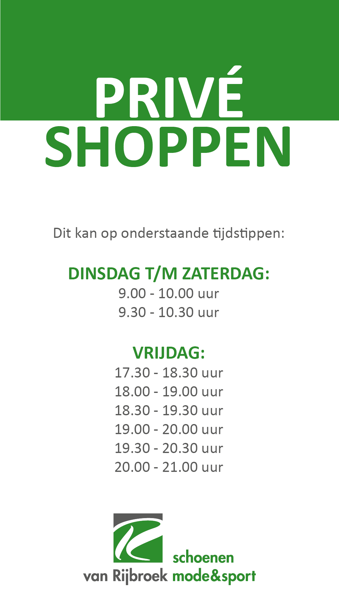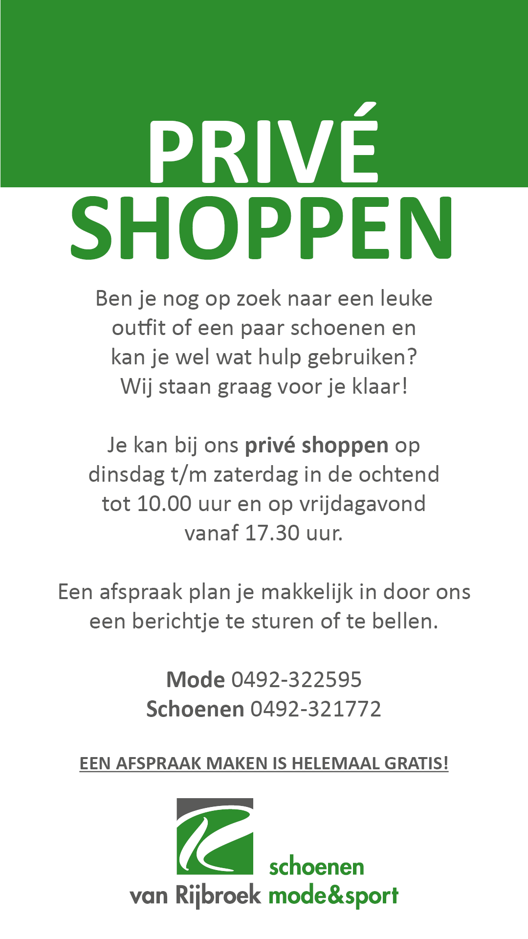 Wij bieden de mogelijkheid tot persoonlijk shoppen. Dit betekent dat je één op één wordt geholpen door onze Style Coach. Dit kan in de ochtenden (dinsdag t/m zaterdag) van 9.00 tot 10.00 uur en op vrijdagavond tussen 17.30 en 21.00 uur. Bel naar 0492-322595 (mode) of 0492-321772 (schoenen) en geef jouw gewenste dag en tijd door.